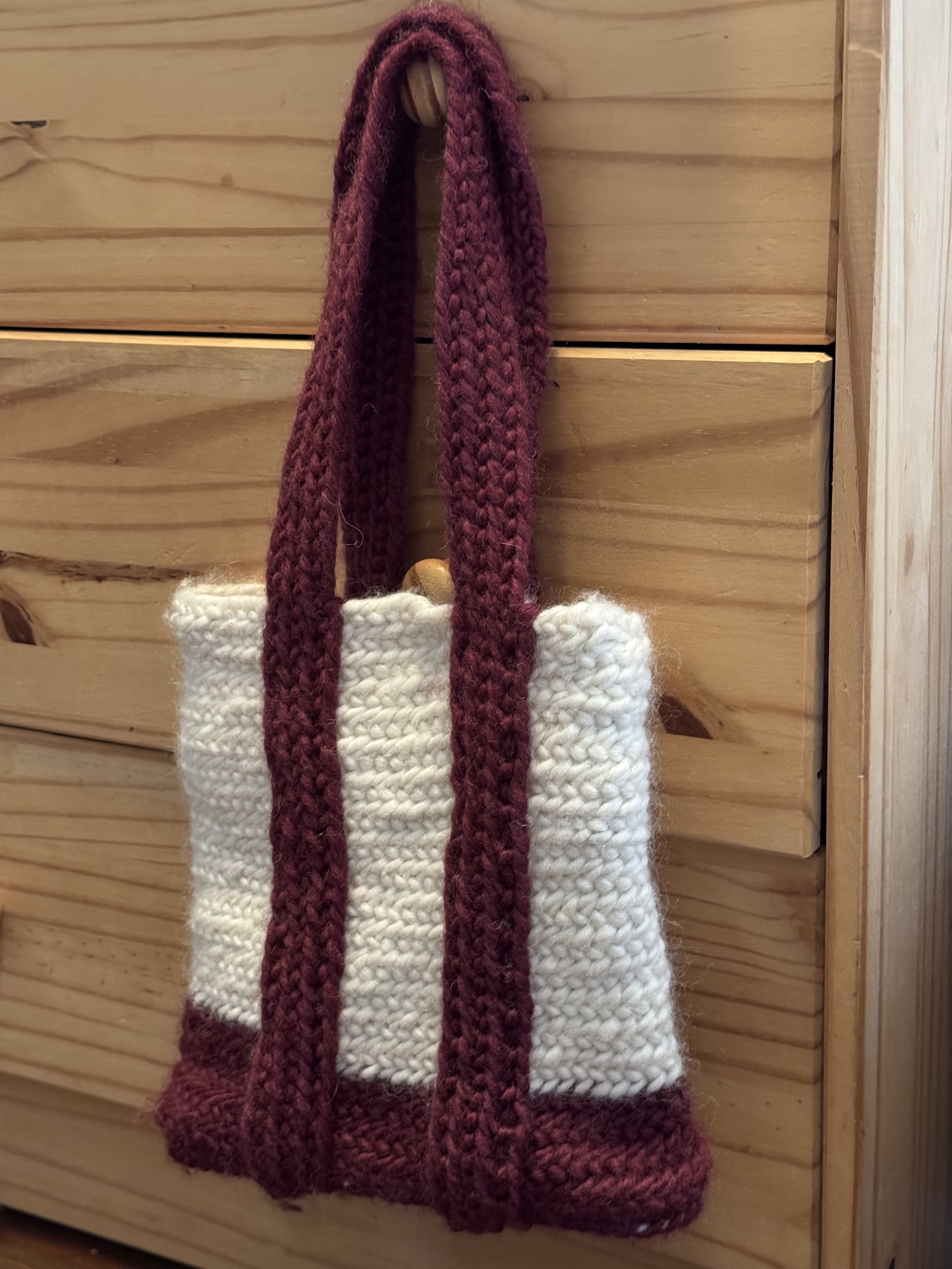 Mini tote bag Artist: Stephanie Cervi Stitch used: Oslo stitch Date completed: February 7, 2026 Materials: Starfish Fibers High Tide, in Natural, 170g, 67m Starfish Fibers High Tide, in Merlot, 66g, 30m Custom-designed 3D printed base insert Related Post navigationPrevious post: Project bag Leave a ReplyCancel reply