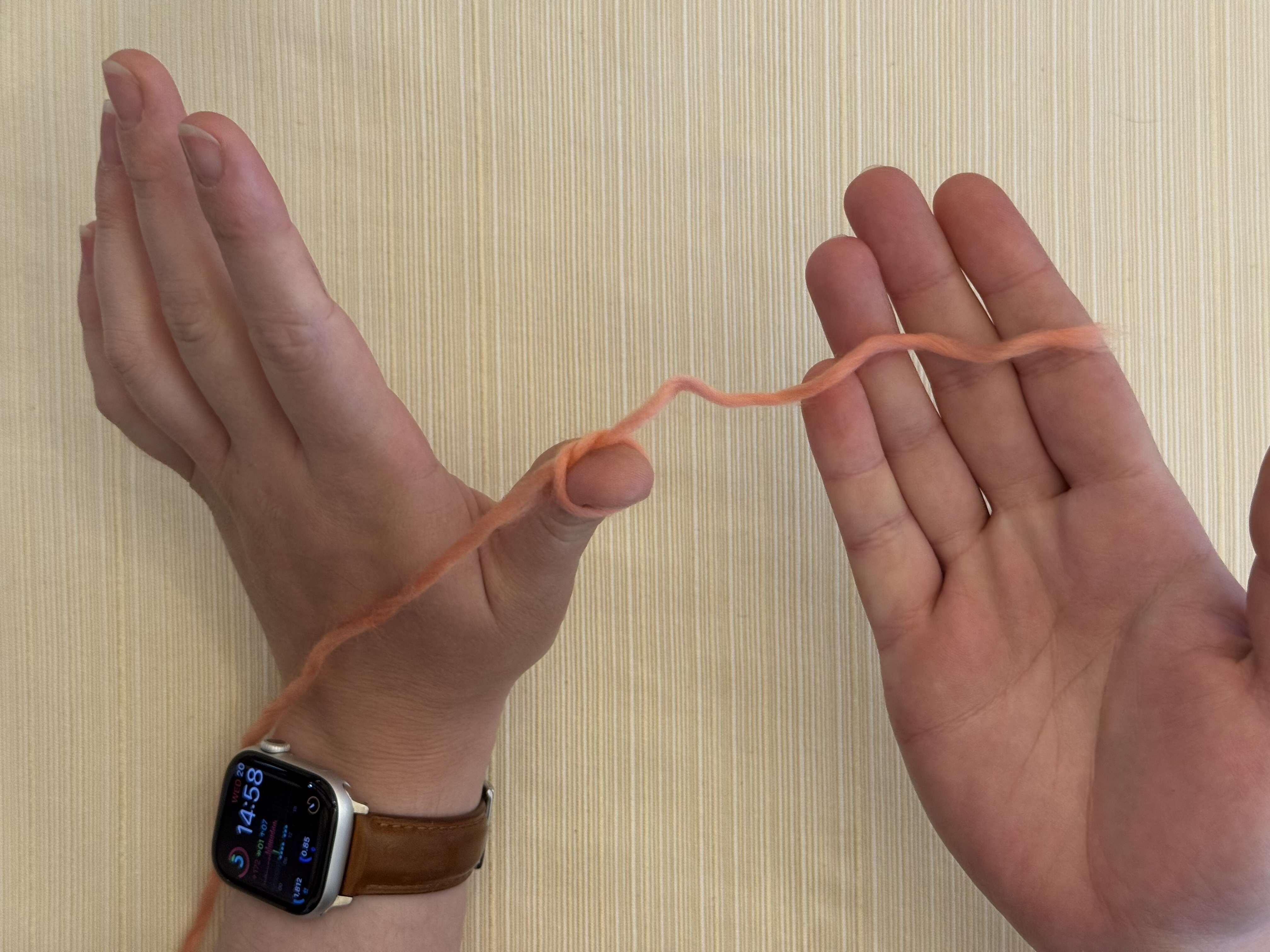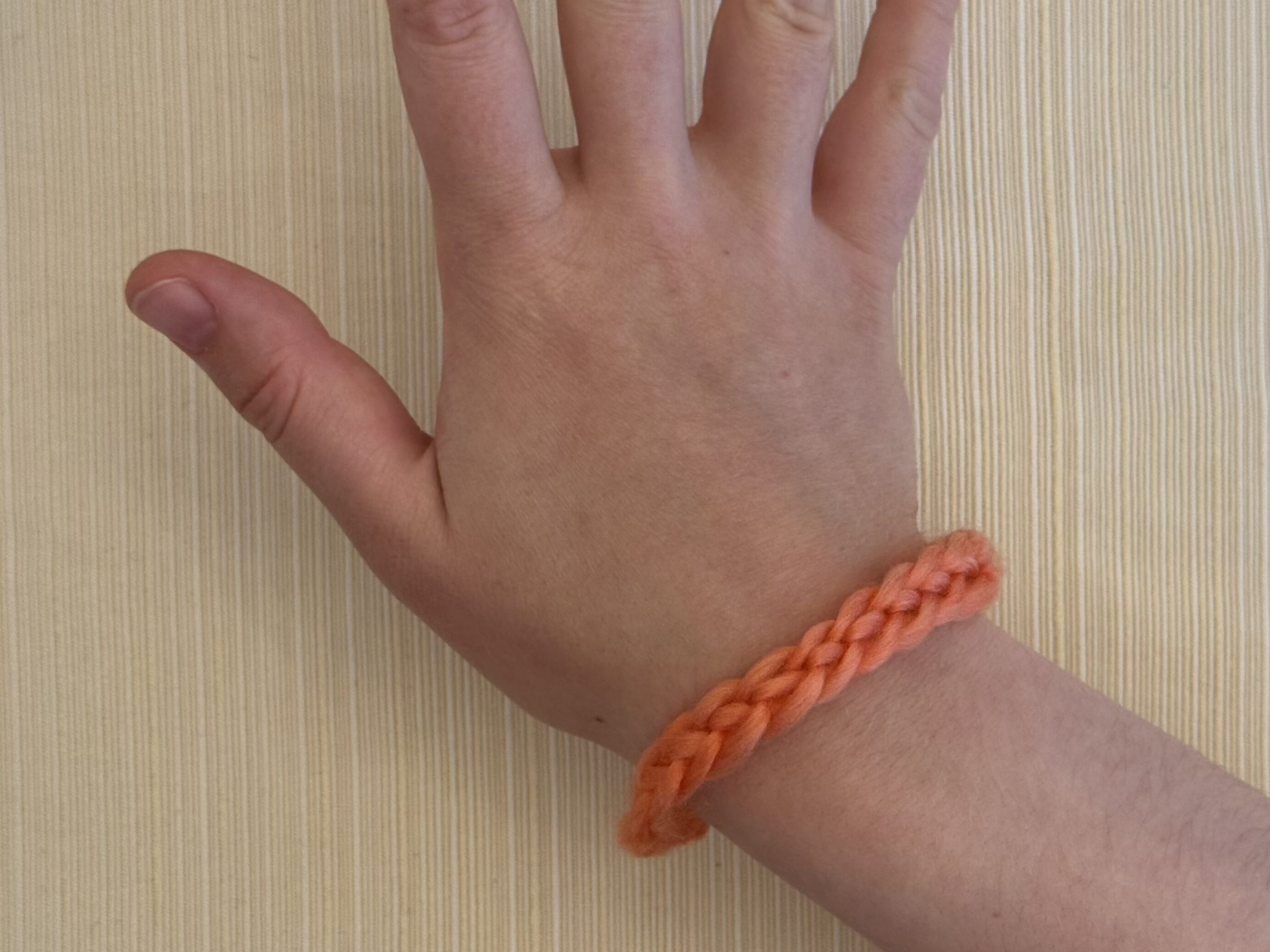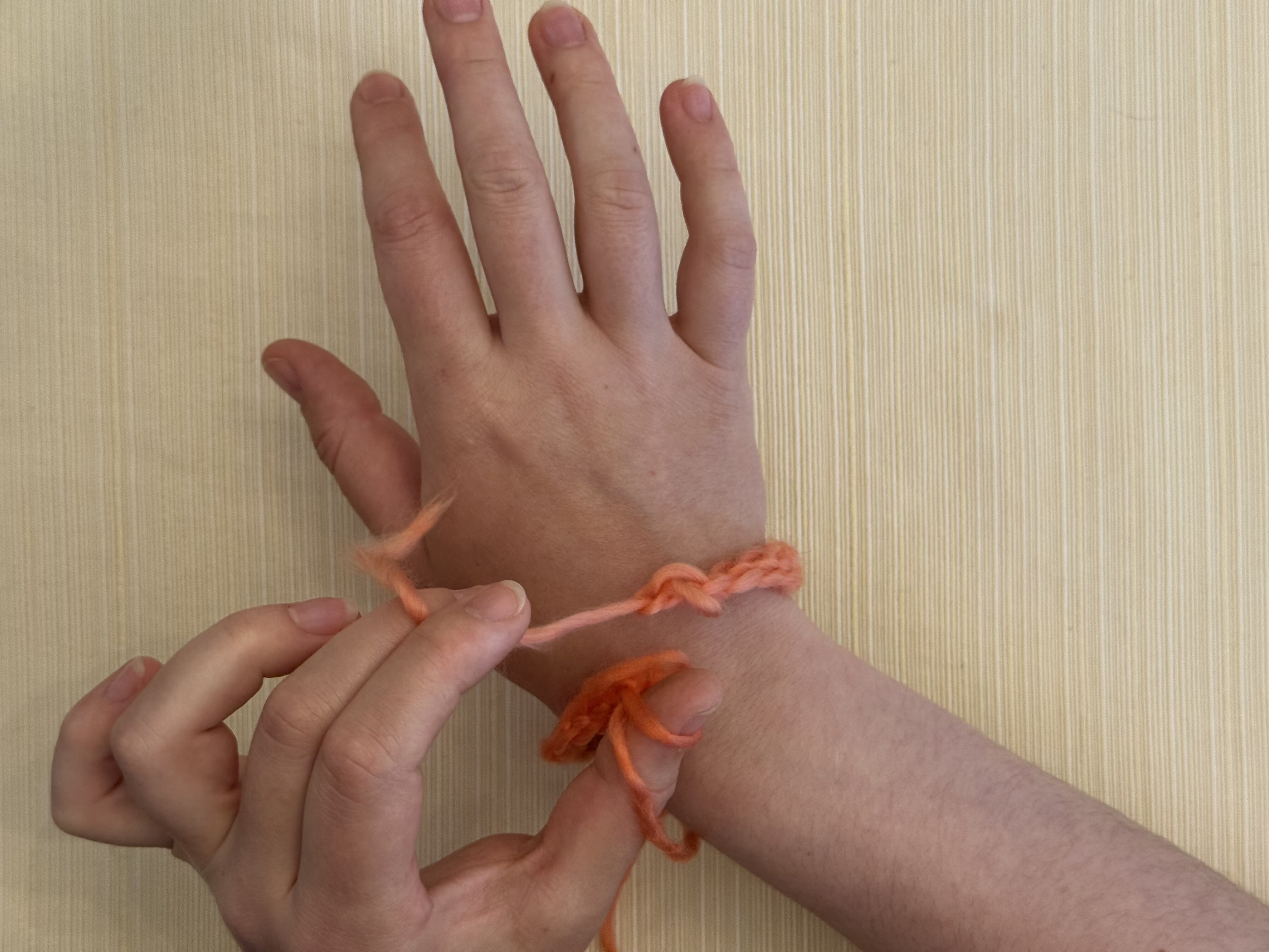 - One armspan’s worth of worsted weight or heavier yarn (makes one bracelet). Fiber content doesn’t matter for right now.