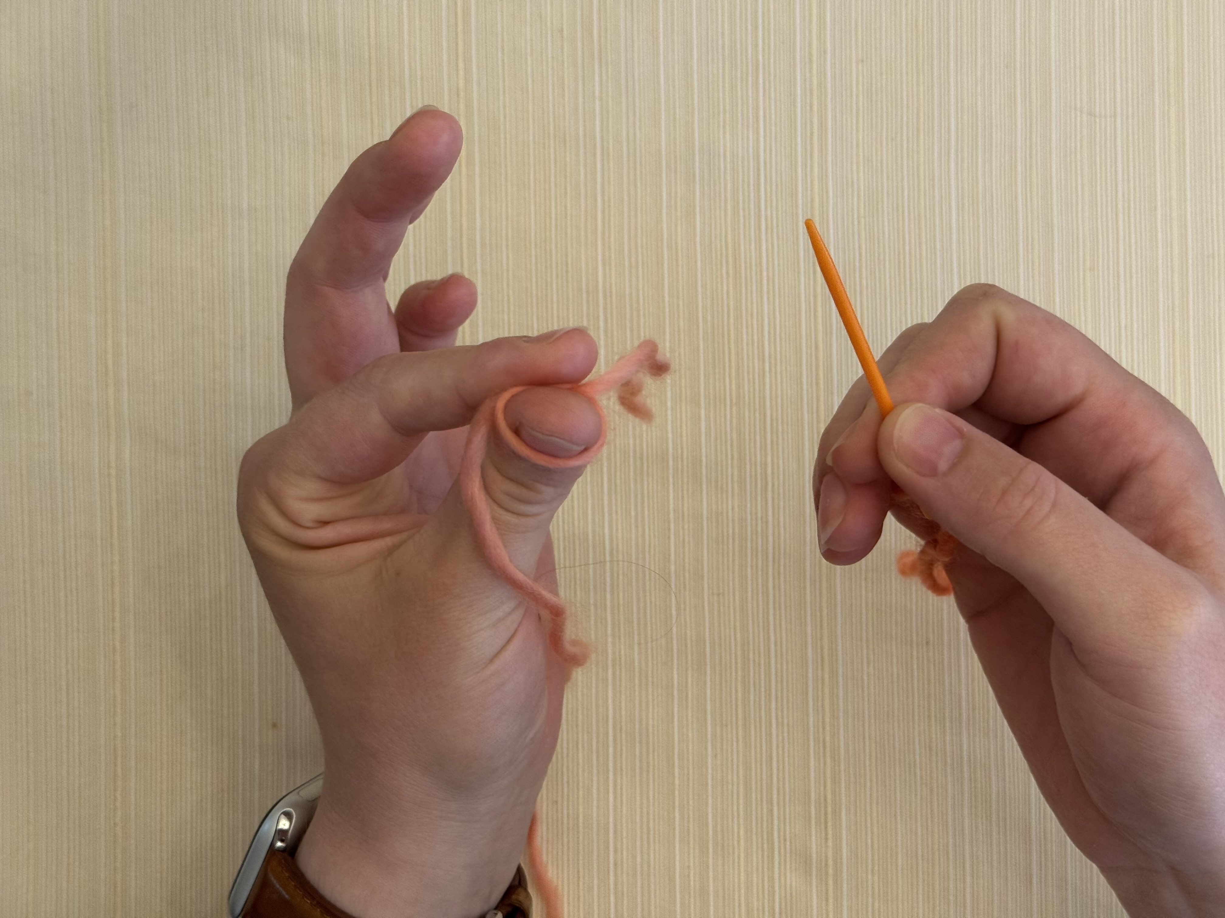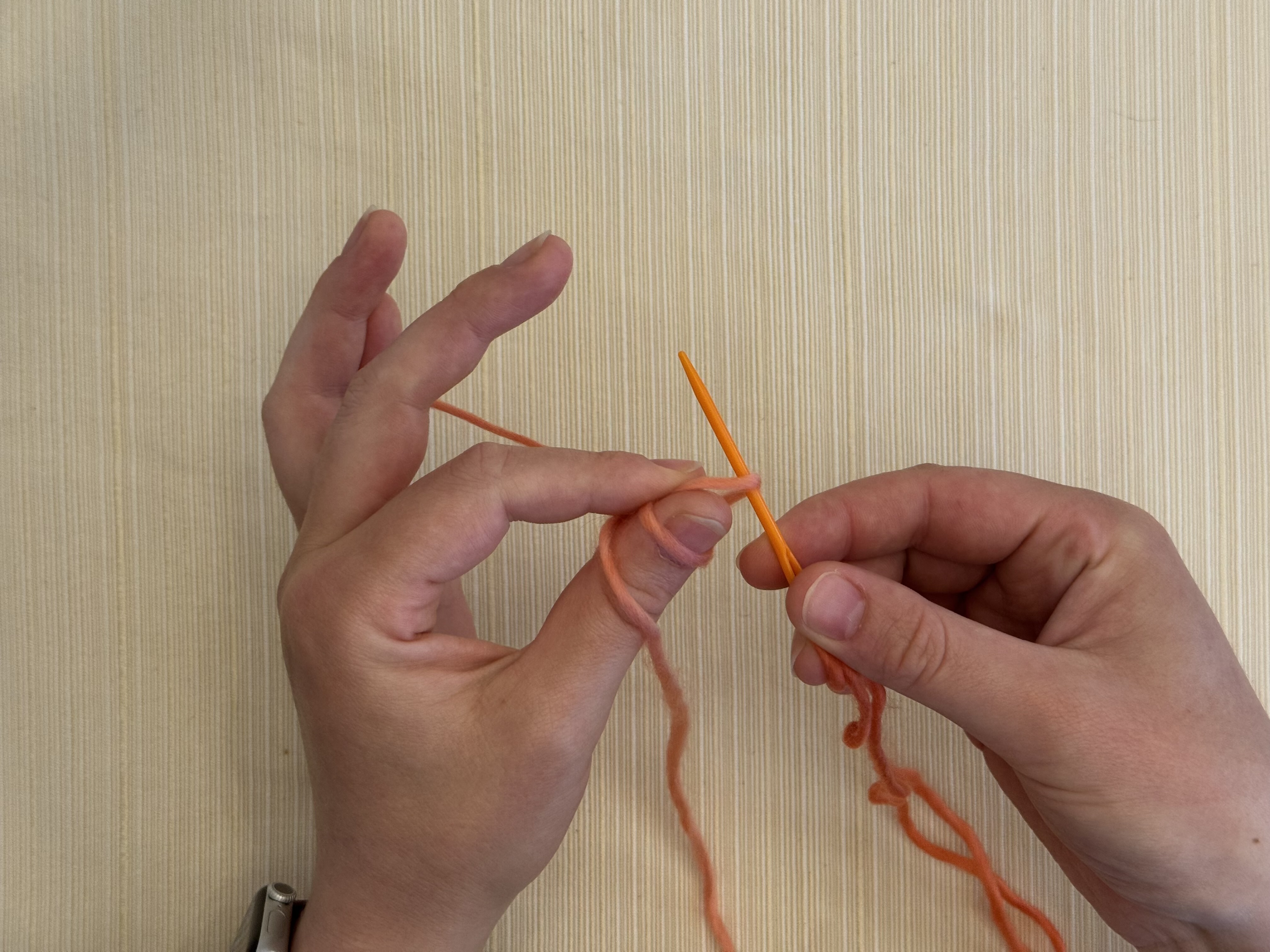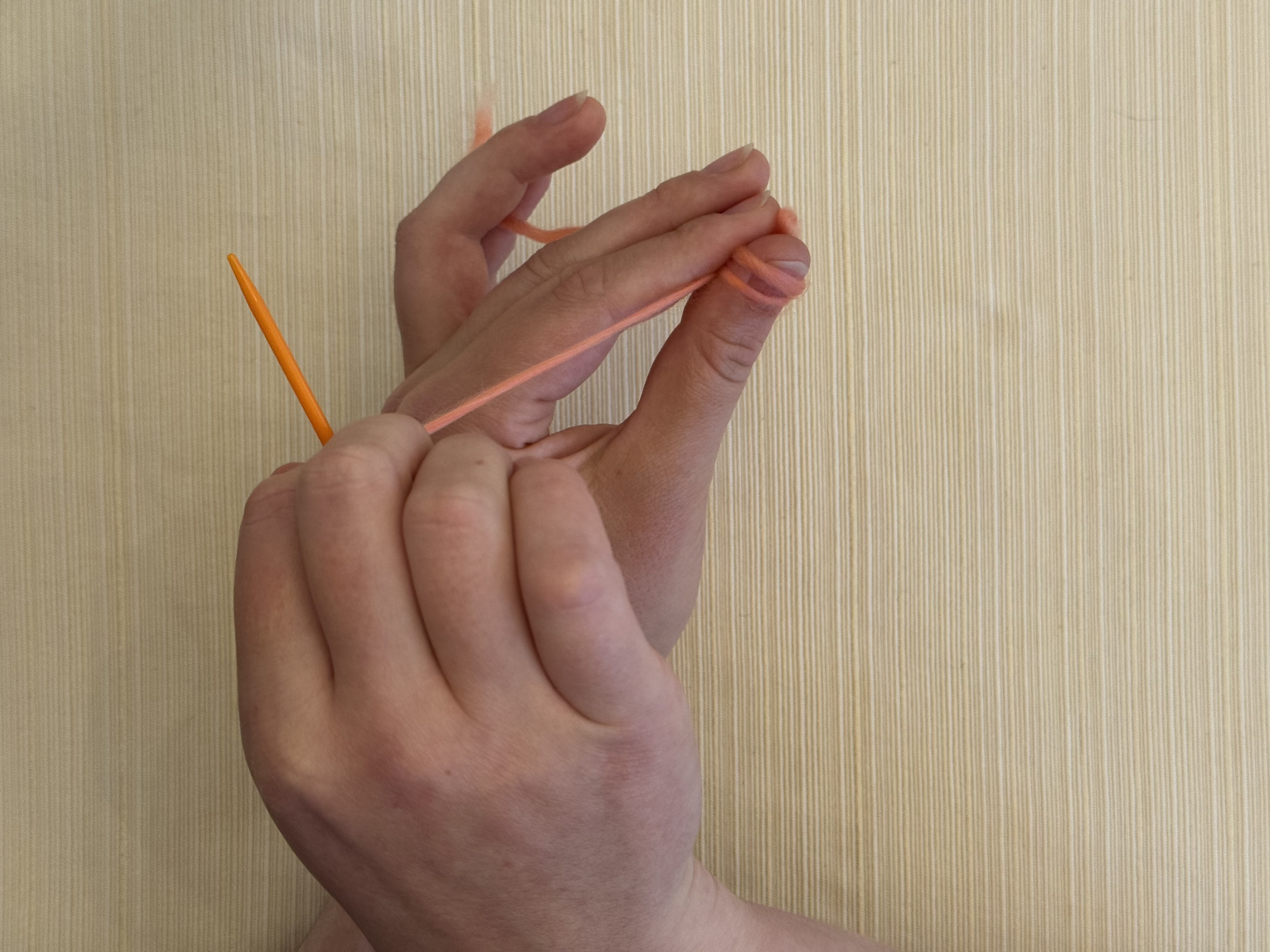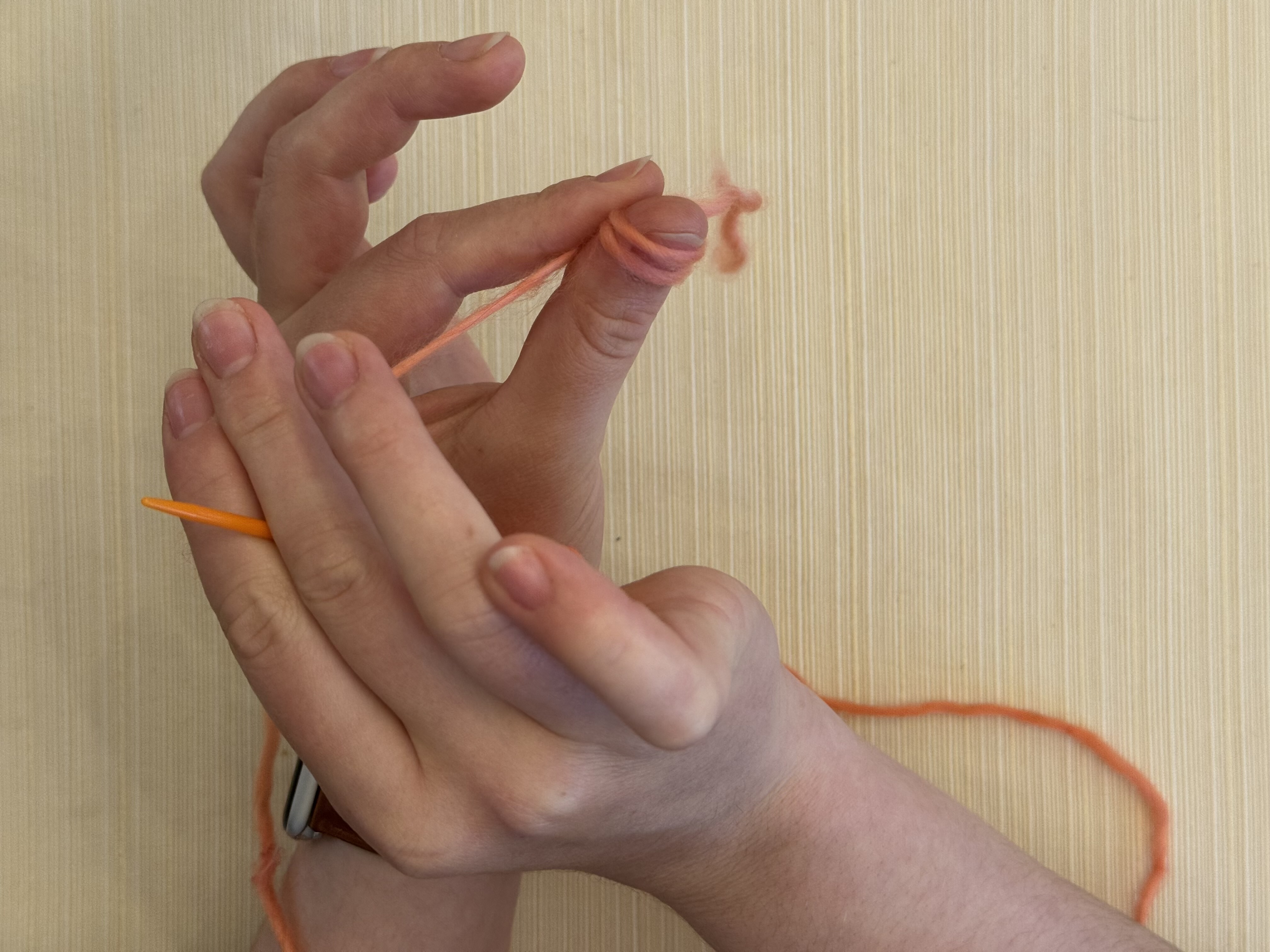 Put the knot around your left thumb, with the twist of the knot against the pad of your thumb and the short tail of the yarn going to the right.