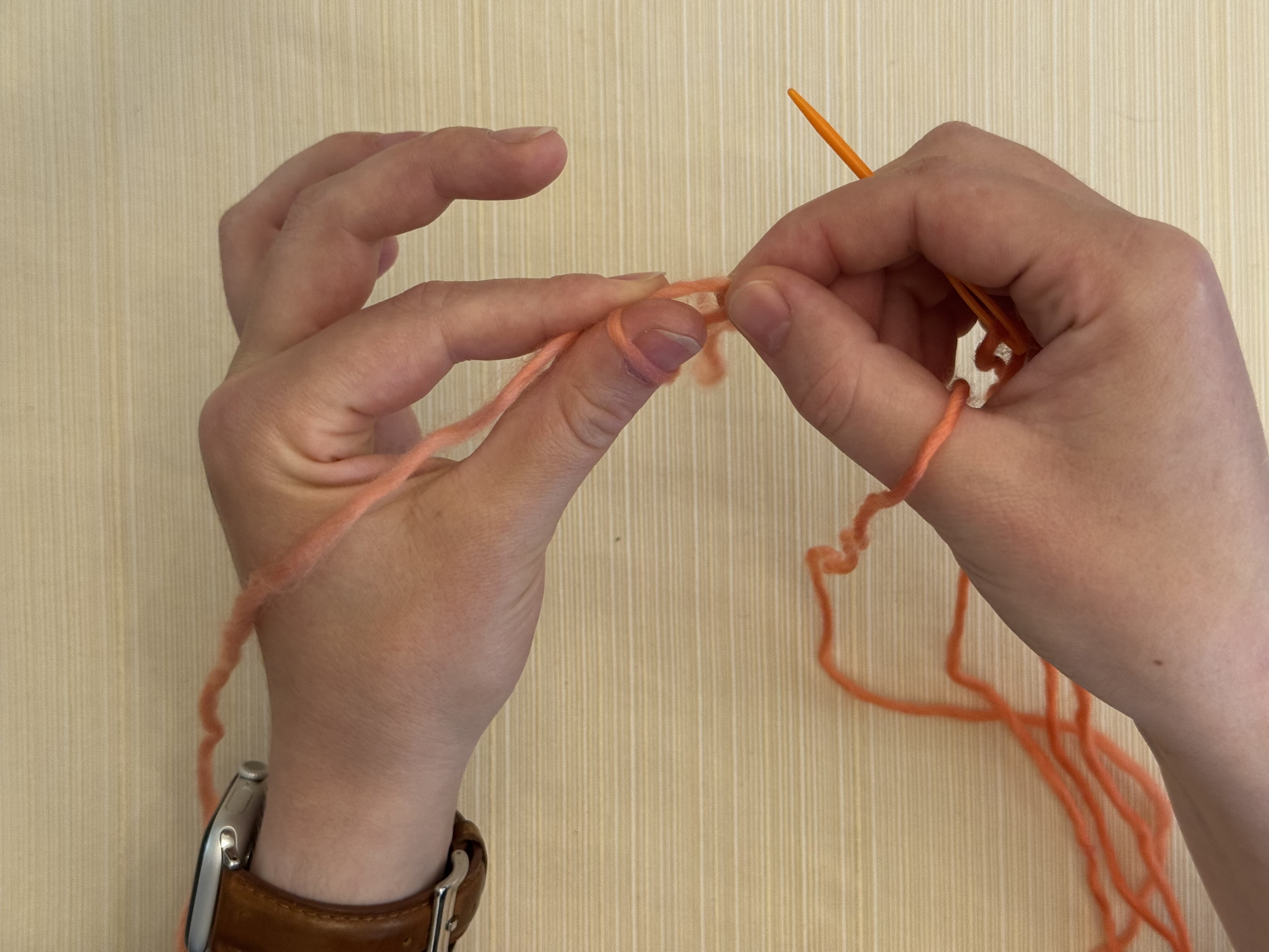 Pull it off the needle while pinching it; you’ll now have a little bump of yarn between your fingers.