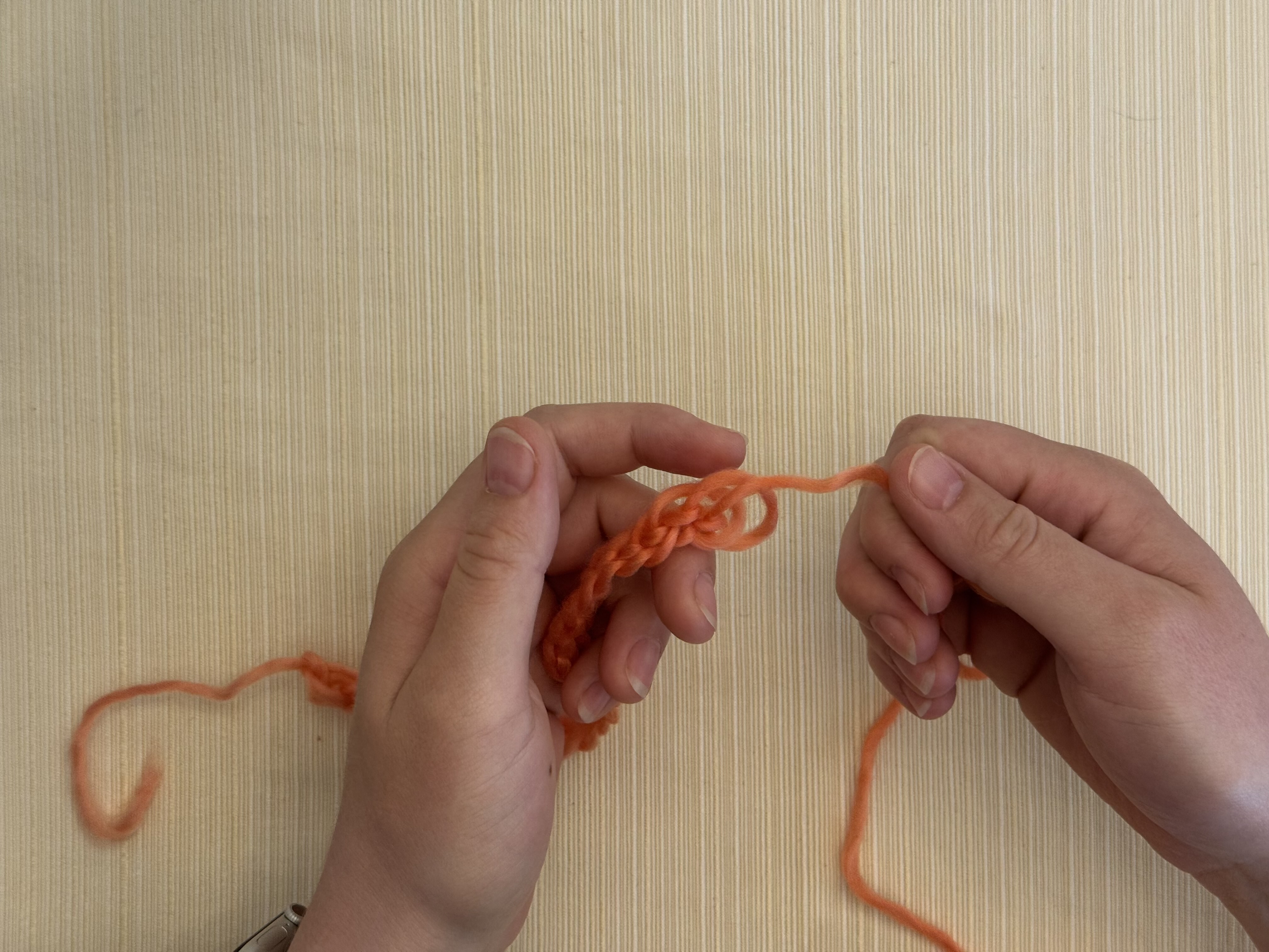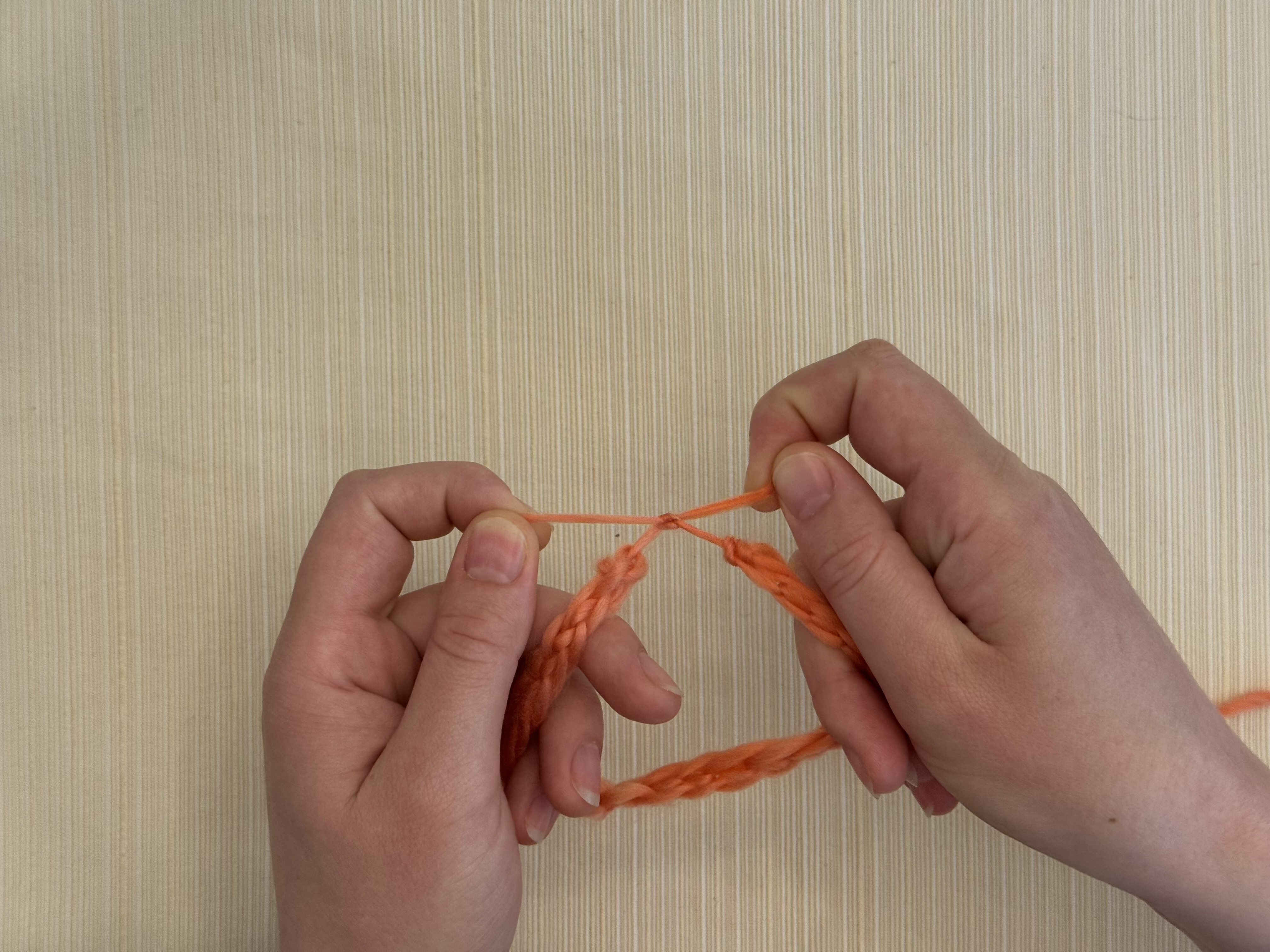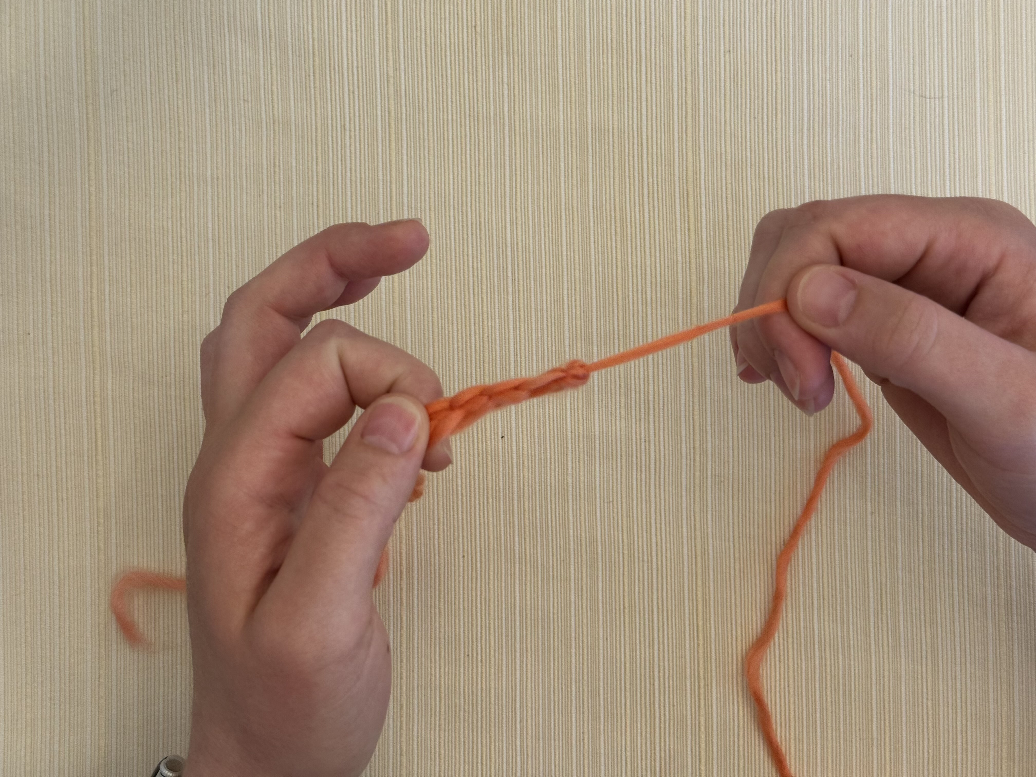 One end at a time, gently pull on the yarn on both ends of the chain to tighten those stitches into secure knots.