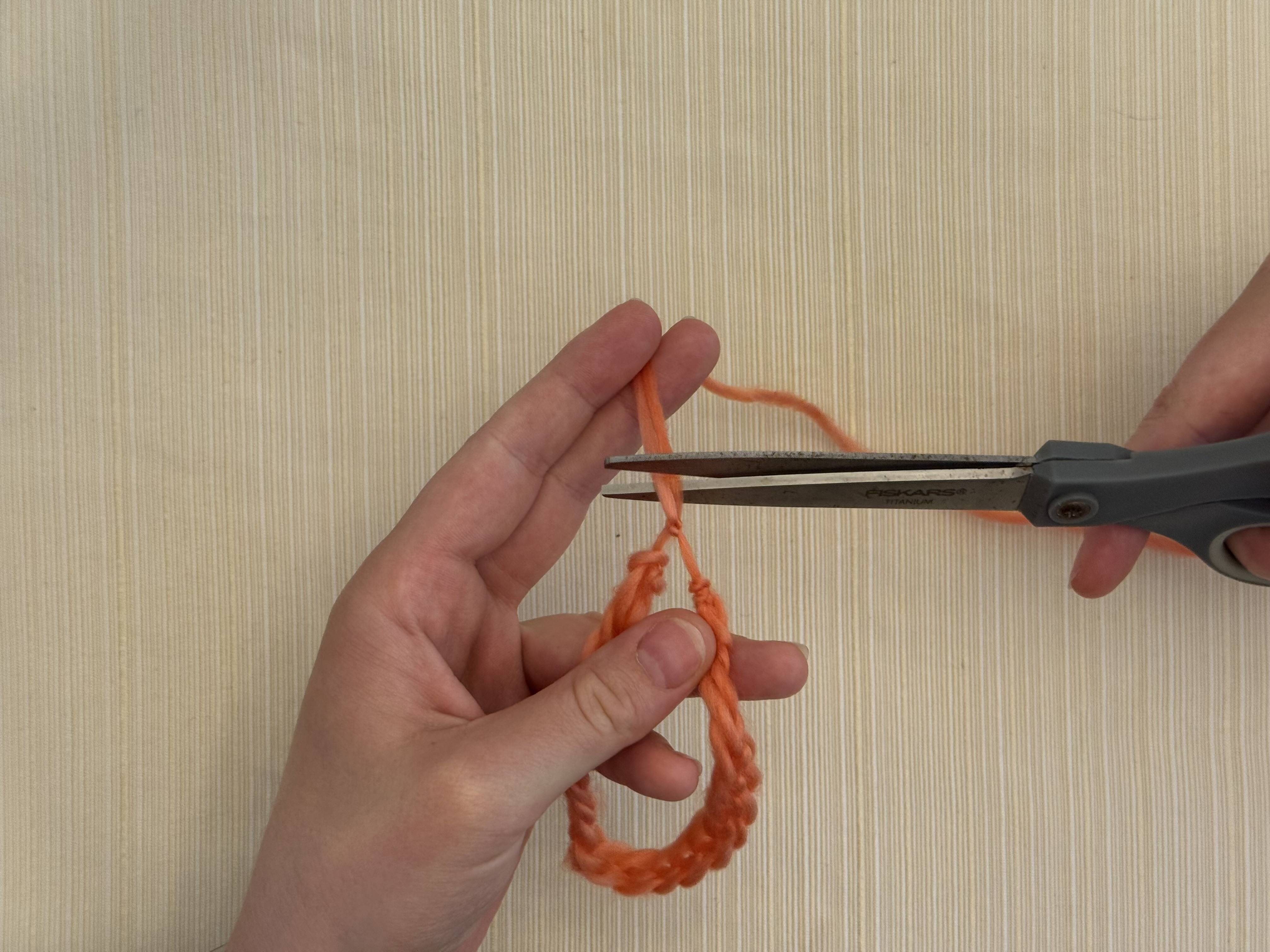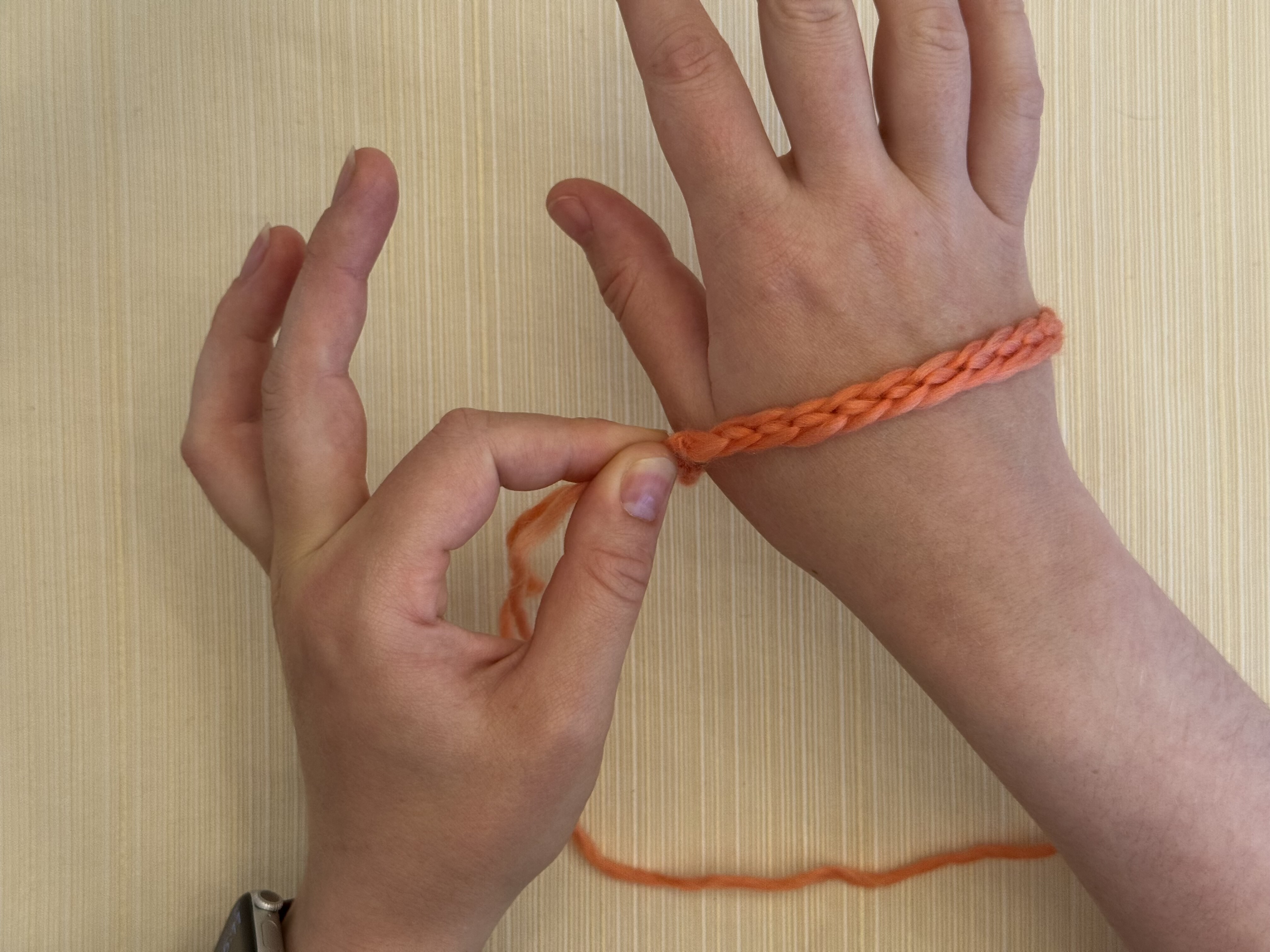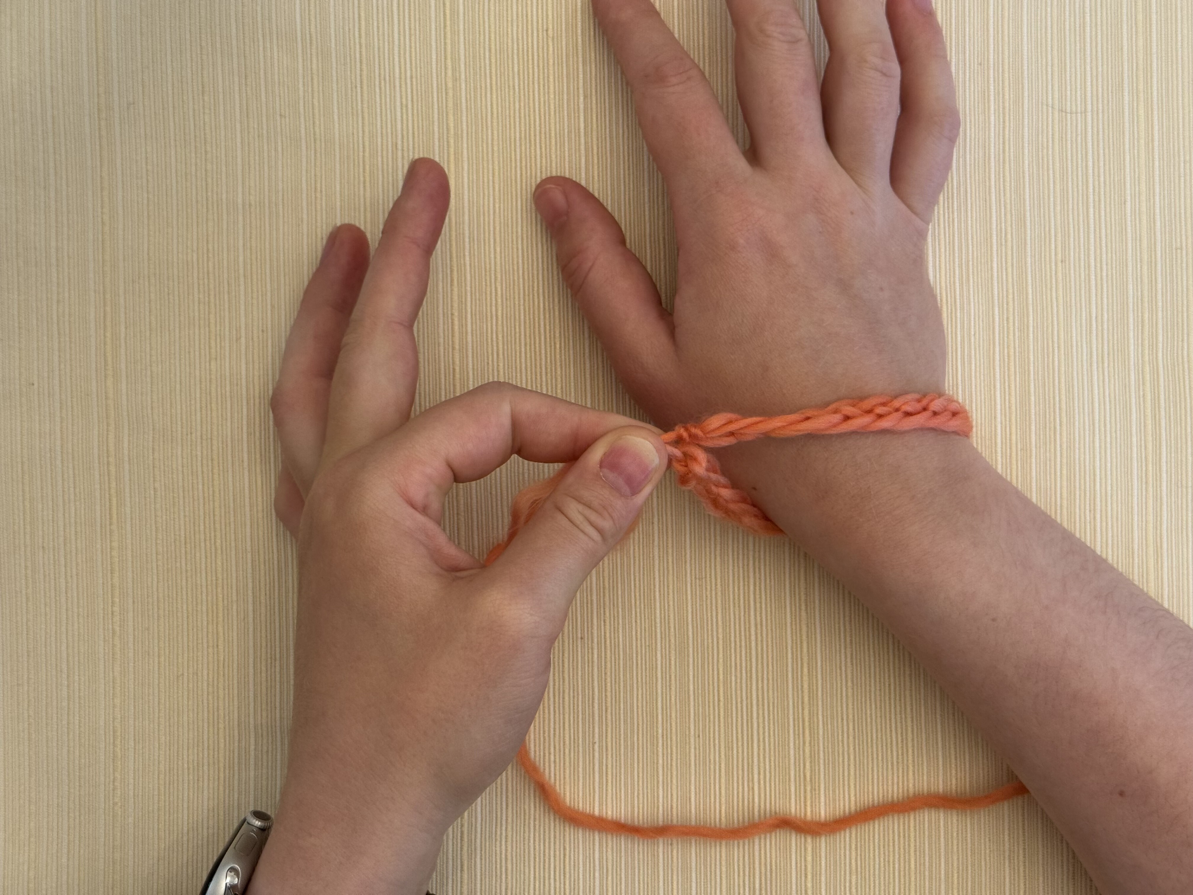 Loop the chain around your wrist, and pinch the yarn where you want to tie the ends together.