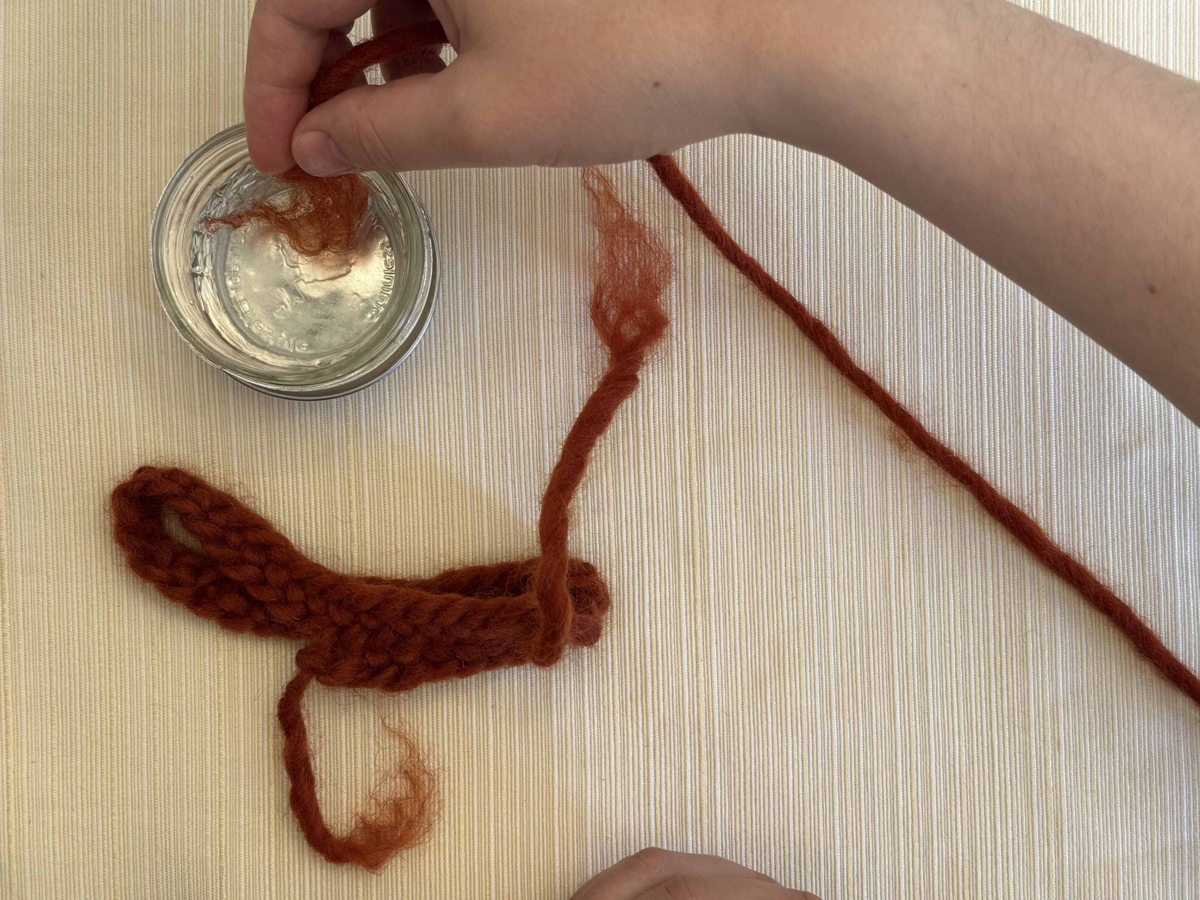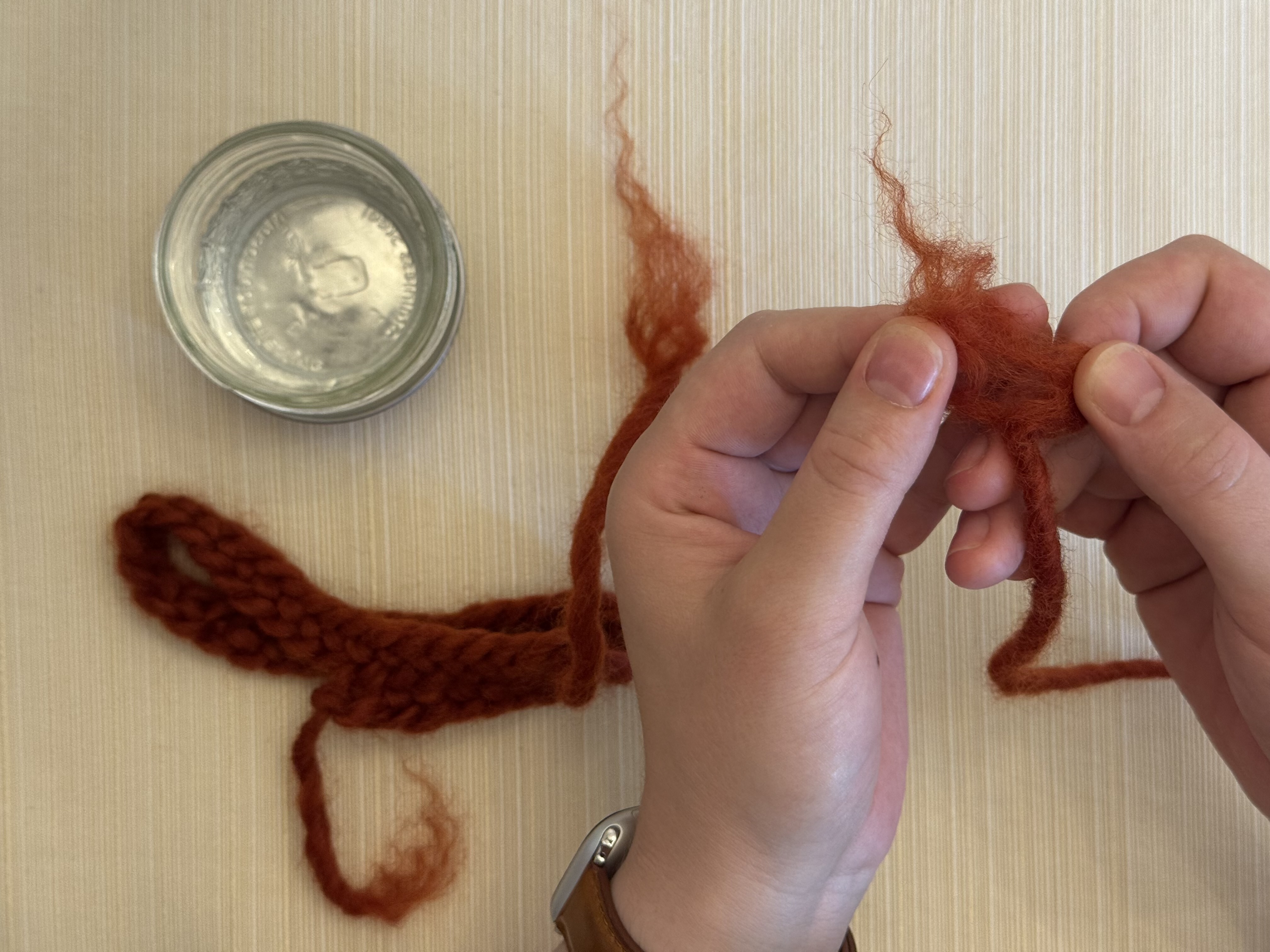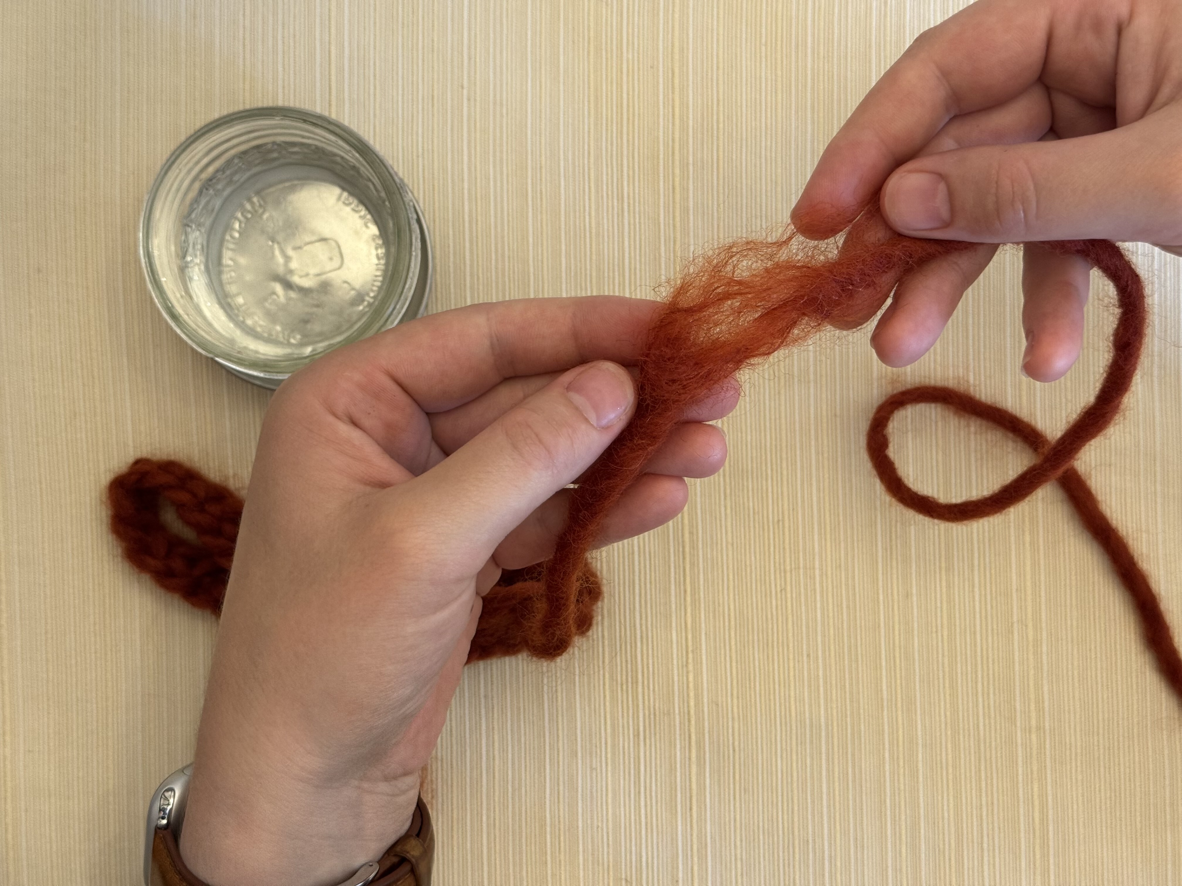 Dip the frayed end of the new length of yarn into the water so it’s damp but not soaking, so it doesn’t drip everywhere.